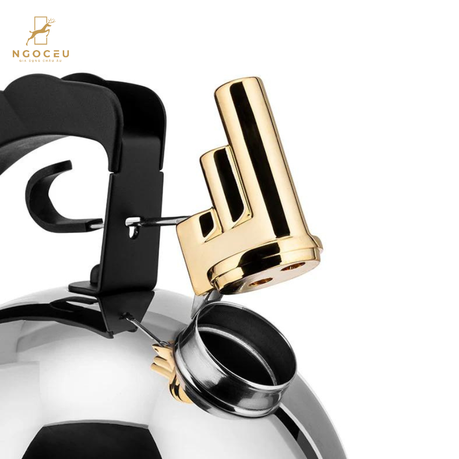 - Thiết kế còi sáo độc đáo: Ấm đun nước 9091 có còi sáo được làm từ đồng thau với hình dáng độc đáo chưa từng thấy trước đây. Còi bao gồm hai lỗ nhỏ với bộ điều chỉnh âm thanh phát ra các nốt "mi" và "si."