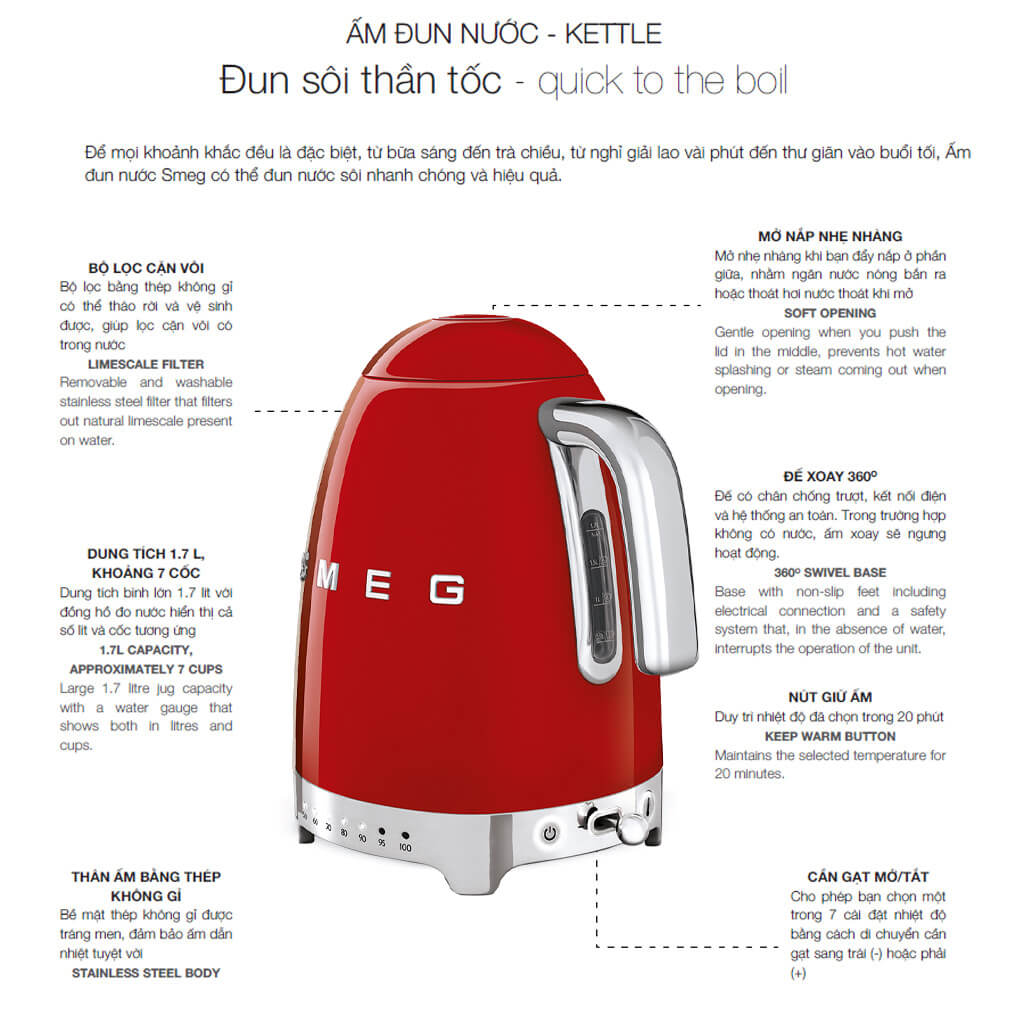 Với sự pha trộn của công nghệ và phong cách hơi retro, ấm đun nước kiểu dáng thiết kế những năm 50 làm cho mọi khoảnh khắc trở nên đặc biệt, từ bữa sáng đến trà chiều, những khoảng khắc nghỉ ngơi thư giãn nhanh để đun sôi nước nhanh chóng , chính xác và hiệu quả.