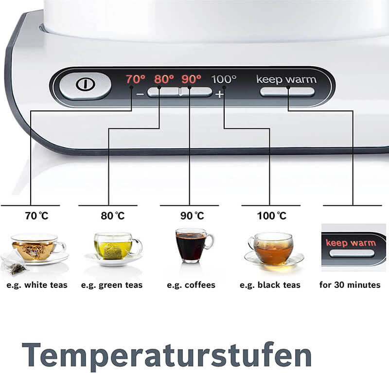 – Chức năng kiểm soát nhiệt độ sôi: có thể chọn nhiệt độ sôi của ấm 70, 80, 90 hay 100 độ C. Khi ấm sôi đến mức nhiệt độ đã được chọn trước sẽ tự động tắt.