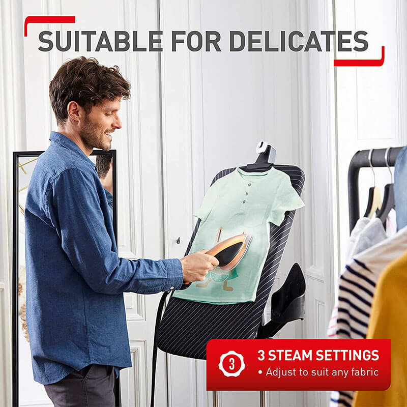 – Đầu hơi nước có trọng lượng bằng một nửa so với bàn ủi truyền thống, giúp ủi dễ dàng hơn Và không có điều khiển phức tạp chỉ cần ba mức hơi nước đơn giản cho kết quả hoàn hảo trên khắp tủ quần áo của bạn; Các loại vải có thể ủi được