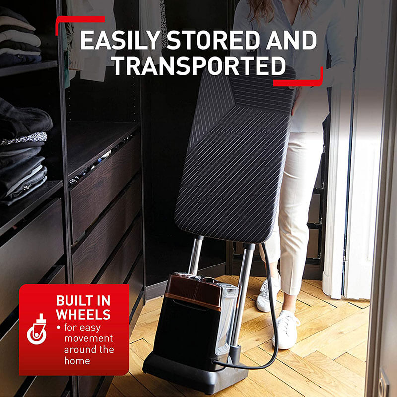 - Nhờ các bánh xe nhỏ dưới trạm hấp bàn ủi, việc vận chuyển được thực hiện dễ dàng, để chăm sóc hàng may mặc cho toàn bộ ngôi nhà của bạn.