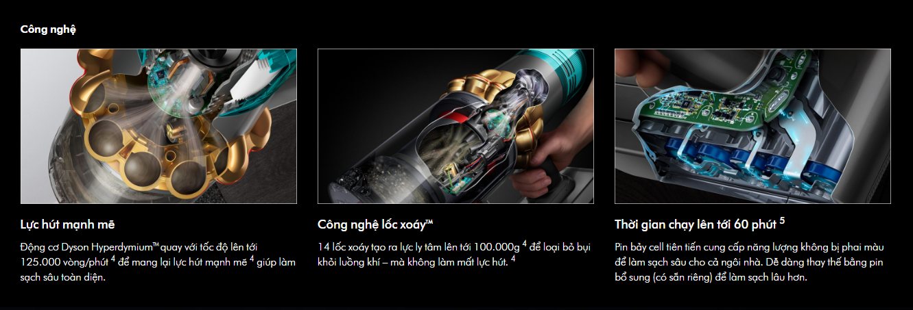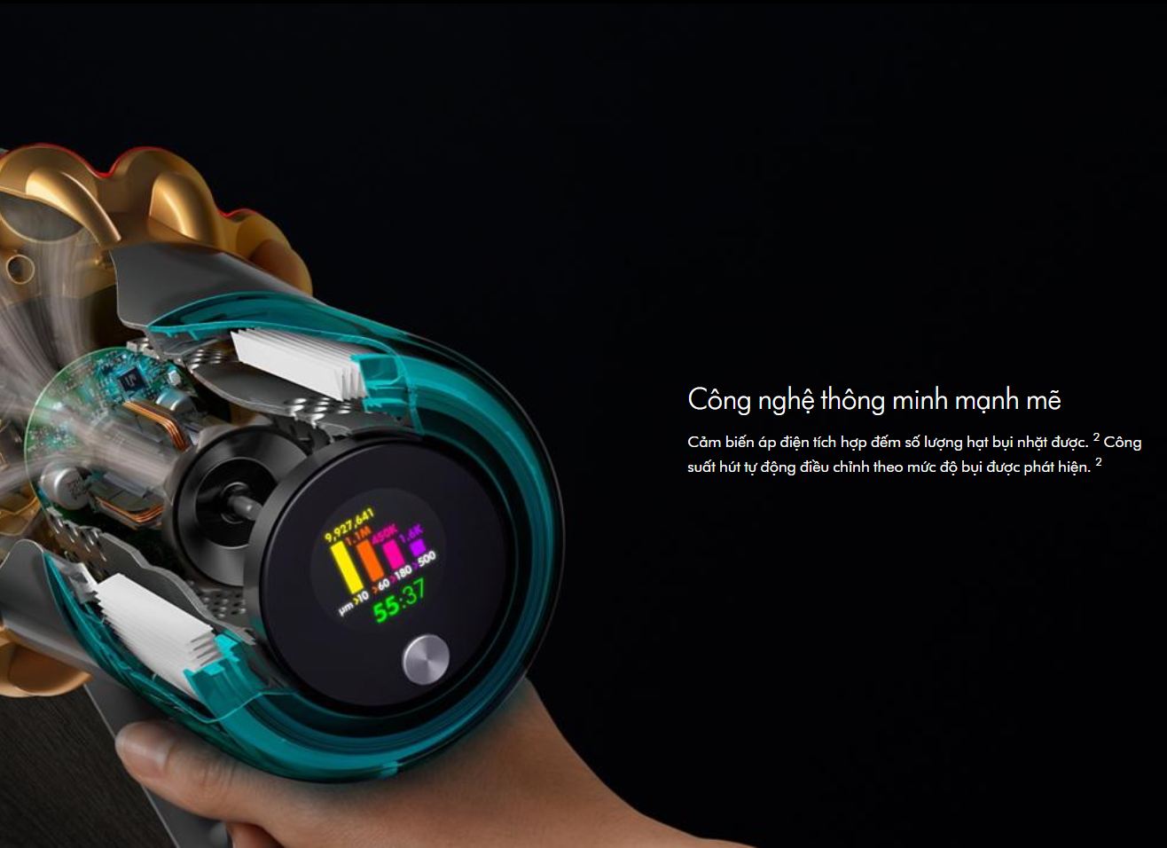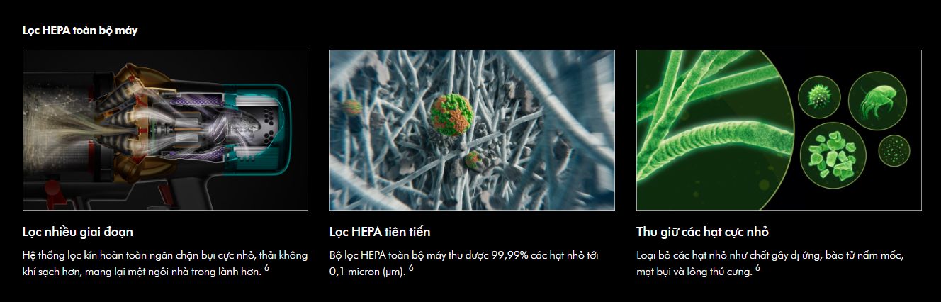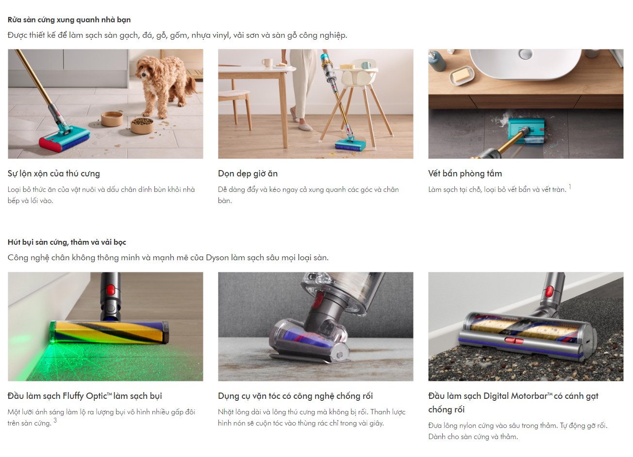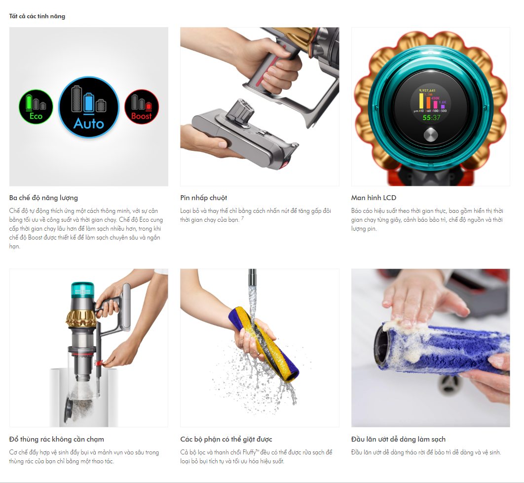 - Chỉ có tại Dyson : Phiên bản HEPA vàng độc quyền có thêm đầu làm sạch Fluffy Optic™, Floor Dok Multi™ và công cụ quét bụi và kẽ hở tích hợp.