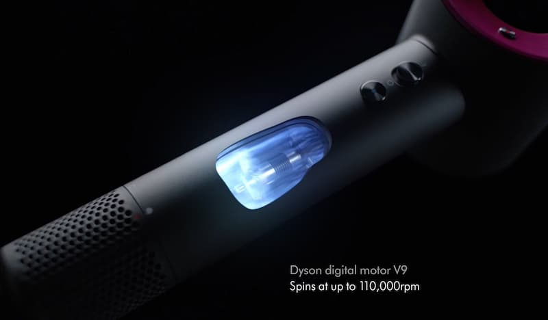 - Sản phẩm được trang bị động cơ V9 (có tốc độ vòng quay lên tới khoảng 110 nghìn vòng/phút) độc quyền của hãng cho phép nó có thể tạo ra những luồng không khí với lực sấy mạnh mẽ gấp 3 lần so với các thiết bị máy sấy tóc thông thường. Vẫn chưa hết, công nghệ Ionic Blow tích hợp đi kèm cũng sẽ giúp hạn chế, ngăn ngừng tình trạng xơ rối tóc vô cùng hiệu quả.