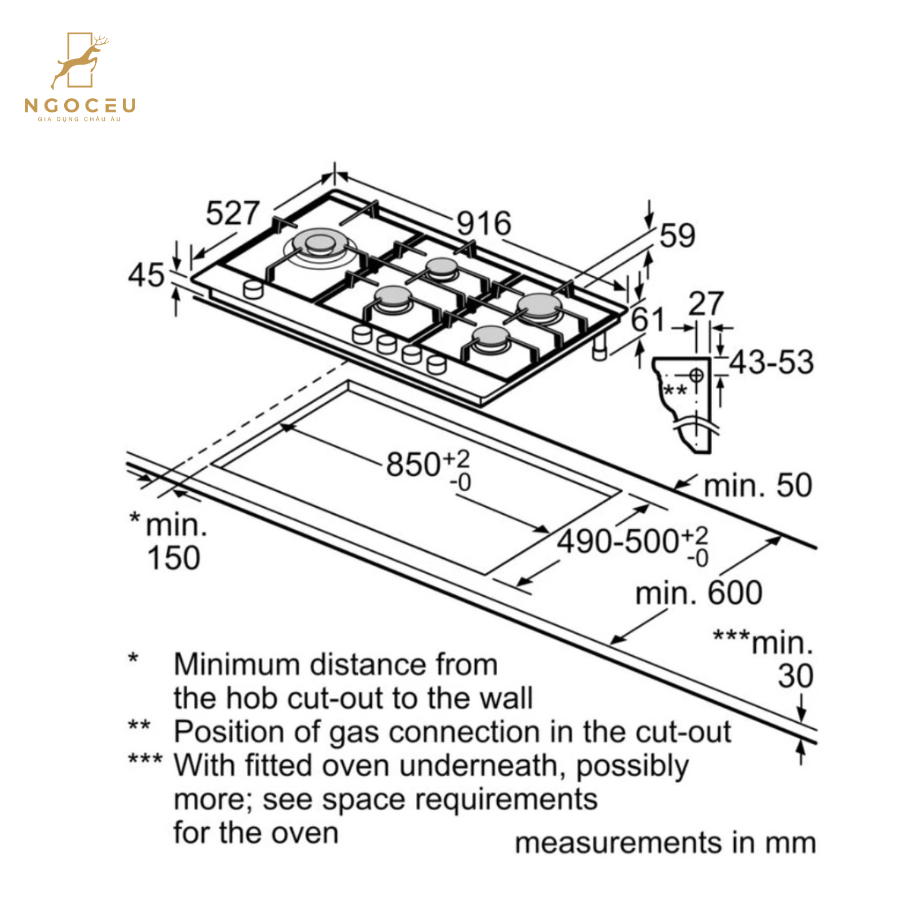 - Kích thước hốc tối thiểu để lắp đặt (H x W x D) 45x850-852x490-502mm