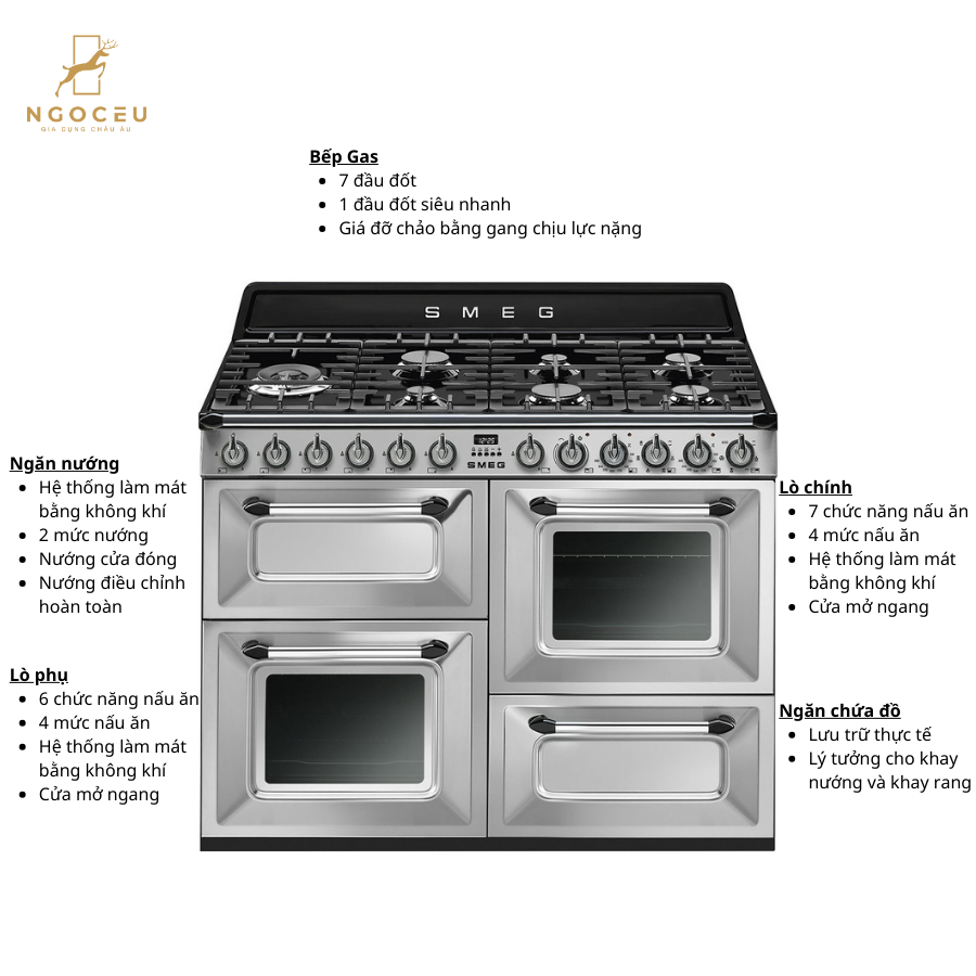 - Bếp đôi nhiên liệu TR4110 rộng 110cm có lò nướng chính và lò nướng phụ đa chức năng từng đoạt giải thưởng , cả hai đều có chức năng nấu thông thường và nấu bằng quạt. Mỗi chiếc đều có dung tích thực 61 lít rộng rãi, 4 vị trí kệ và có cửa mở bên.