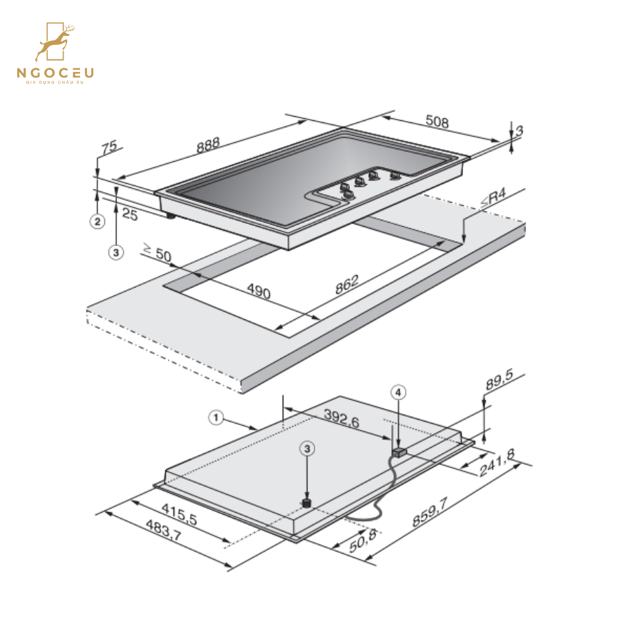 - Kích thước cắt lắp bề mặt (R x S): 862 x 490 mm