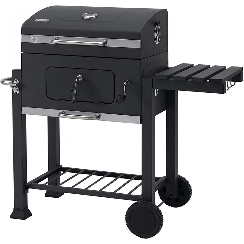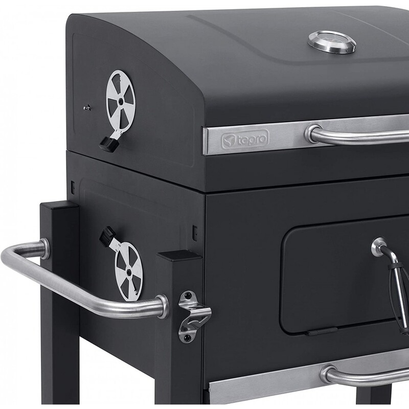 Bếp nướng ngoài trời Tepro có khe tự hút gió để điều chỉnh lưu lượng gió, ngăn để than kín đáo được thiết kế như cánh tủ, giá đỡ bên dưới và bên cạnh để gia vị tiện lợi, phụ kiện kèm theo( 2 vỉ nướng bằng thép không gỉ, 2 khay để đồ, dụng cụ kẹp gắp, mở bia tích hợp trên bếp).