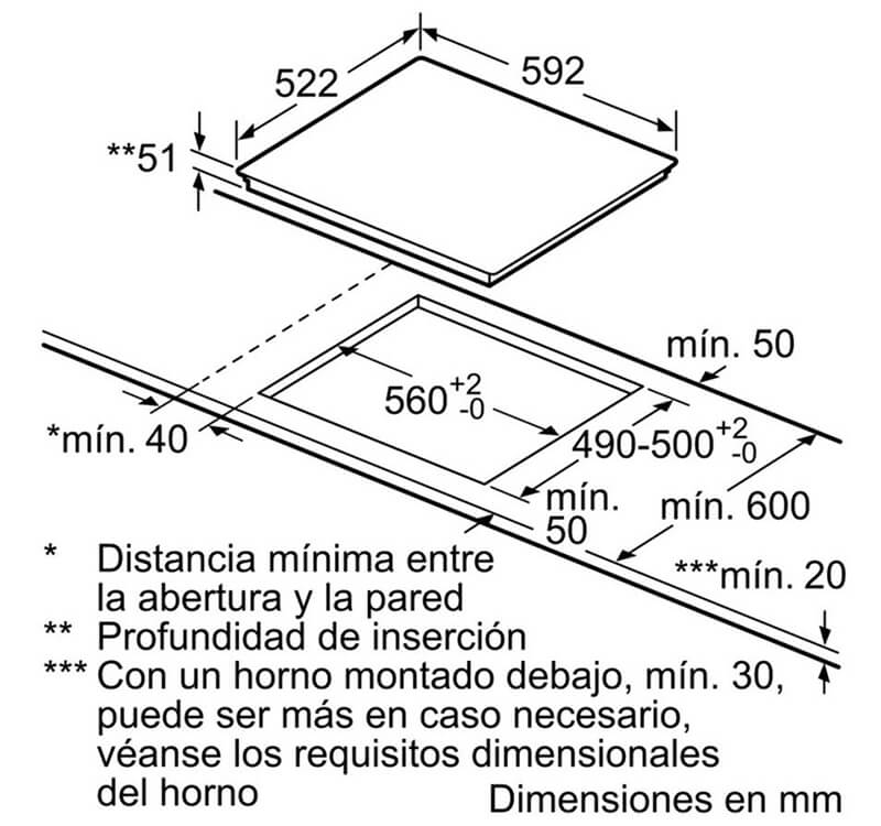– Kích thước lắp đặt (HxWxD mm): 51 x 560 x 490 – 500 mm