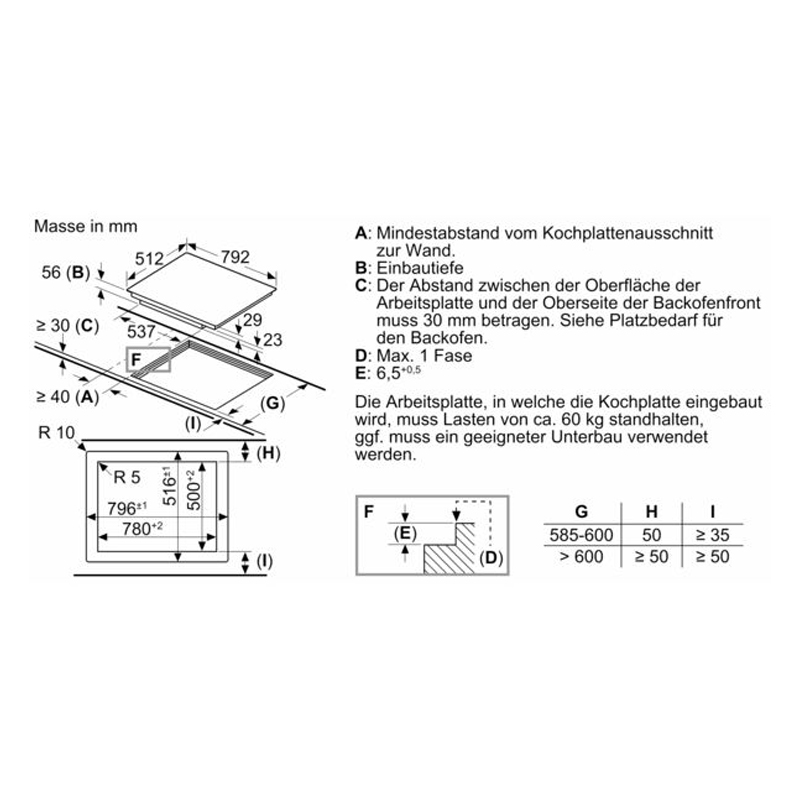 – Vùng nấu: 1 x Ø 400 mmx240 mm, cảm ứng 3,3 kW (mức công suất tối đa 3,7 kW) hoặc cảm ứng 2 x Ø 200 mm, 2,2 kW (mức công suất tối đa 3,7 kW); Cảm ứng 1 x Ø 280 mm, 2,6 kW (mức công suất tối đa 3,7 kW); cảm ứng 1 x Ø 145 mm, 1,4 kW (mức công suất tối đa 2,2 kW)