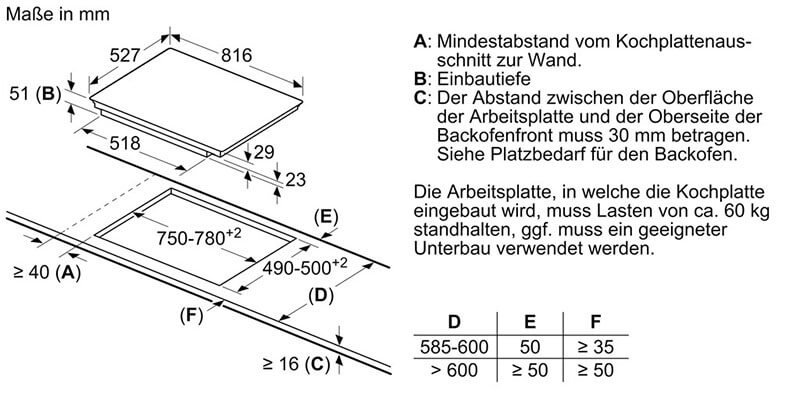 – Kích thước lắp đặt (HxWxD mm): 51 x 750-780 x 490-500