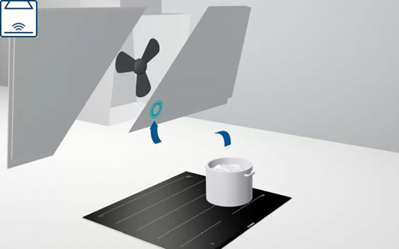 - Kiểm soát các chức năng của máy hút mùi thông qua bếp của bạn. Cả bếp điện và mui xe đi kèm đều được trang bị mô-đun Wi-Fi, cho phép chúng tương tác với nhau. Ngay sau khi bếp của bạn được kích hoạt, máy hút mùi của bạn cũng được bật và bắt đầu thoát hơi nước khó chịu ngay khi bạn bắt đầu nấu ăn. Khi bạn nấu xong, máy hút mùi sẽ tự động tắt sau một thời gian hoạt động ngắn, vì vậy bạn có thể chắc chắn rằng mùi khó chịu trong bếp thực sự biến mất. Nếu bạn muốn điều khiển trực tiếp máy hút mùi, chỉ cần kích hoạt chế độ thủ công trên bộ điều khiển bếp chỉ bằng một nút chạm. Sau đó, bạn có thể kiểm soát mức công suất của máy hút mùi thông qua giao diện người dùng trên bếp của bạn. Ngoài tốc độ khai thác, bạn cũng có thể điều khiển ánh sáng máy hút mùi thông qua bếp. Chỉ với một bộ điều khiển, bạn có thể kiểm soát tất cả: bếp nấu và máy hút mùi của bạn.