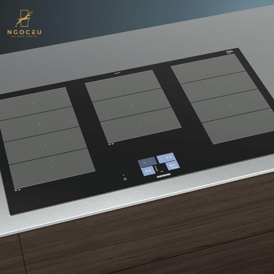 - Nấu ăn nhanh chóng với 5 vùng nấu đa điểm cho tổng công suất 11100W: Bếp từ Siemens EX975KXW1E IQ700 được thiết kế với 5 vùng nấu có kích thước