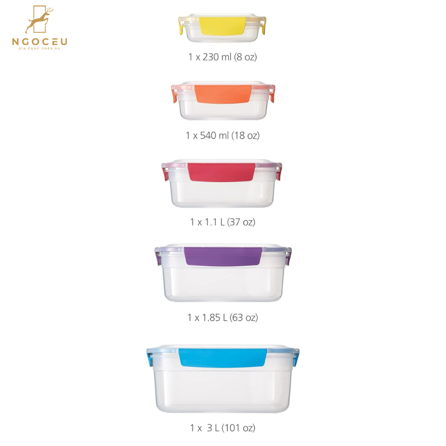 –  Các hộp khác nhau có nắp và đáy được phân biệt bởi màu sắc nên dễ dàng tìm khớp. Sử dụng được trong tủ đông, lò vi sóng, trong máy rửa bát với nắp đậy. Nắp đậy rất kín, chống dò rỉ, bạn có thể đựng nước, soup, canh hay các chất lỏng khác mà không sợ dò rỉ.