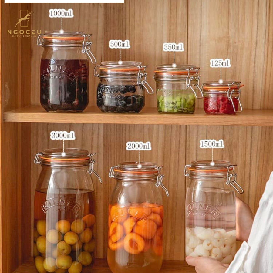 - Hũ thủy tinh Kilner có nhiều dung tích đa dạng phù hợp với nhiều nhu cầu sử dụng khác nhau. Bạn có thể sử dụng hũ để ướp đồ muối chua, làm đồ ngâm, làm rượu hoa quả, làm mứt, đựng gia vị, hạt khô, ngũ cốc, các loại pasta, bột, trà, cà phê...