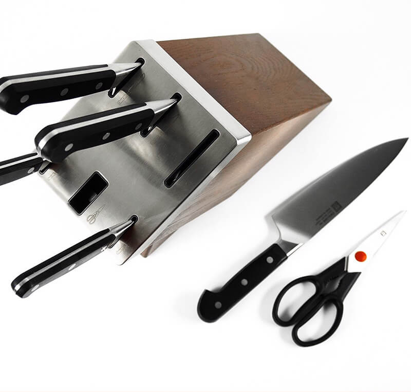Thiết kế bộ dao đơn giản nhưng mang đậm sự sang trọng trong căn bếp của bạn. Có hai viên đá mài bằng sứ được tích hợp trong các khe cho dao có lưỡi cắt mịn, được bố trí ở góc mài lý tưởng. Khi kéo ra, các lưỡi dao lướt trên đá mài, nhẹ nhàng làm sắc chúng. Dao của bạn luôn sắc bén và sẵn sàng để sử dụng - mà không cần nỗ lực.