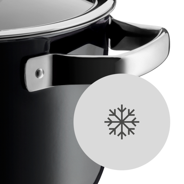 - Tay cầm rỗng nóng lên ít hơn đáng kể so với tay cầm thông thường vì chúng làm giảm sự truyền nhiệt từ dụng cụ nấu sang tay cầm (không áp dụng khi sử dụng trong lò nướng). Phần vòi silicone gắn thêm trên tay cầm của xoong có thể tháo rời và chỉ phù hợp khi sử dụng nồi trên bếp. Không sử dụng trong lò nướng!