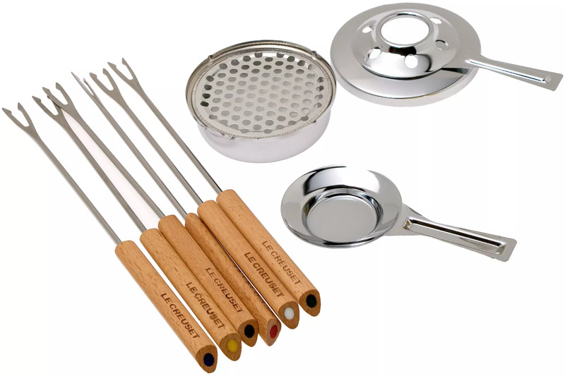 - Bộ fondue gồm: 1 nồi, 1 giá đứng, 1 khay đựng cồn, 6 nĩa xiên