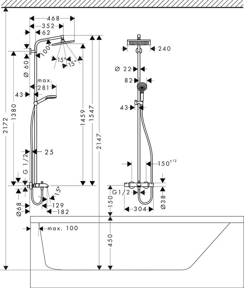 – Hệ thống vòi hoa sen bao gồm: Vòi sen trên cao (240 x 240 mm), vòi sen tay (đường kính 100 mm)