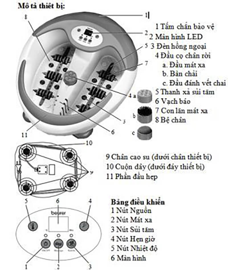 – Chức năng hẹn giờ: Bạn có thể cài thời gian sử dụng từ 20 đến 60 phút với chức năng hẹn giờ. Mỗi lần nhấn nút hẹn giờ (4), thời gian sẽ tăng thêm 10 phút. Hết thời gian cài đặt, máy sẽ tự động tắt. Thời gian sử dụng tối đa là 60 phút một lần. Sau đó tắt bồn, nghỉ ít nhất 15 phút trước khi sử dụng lại.