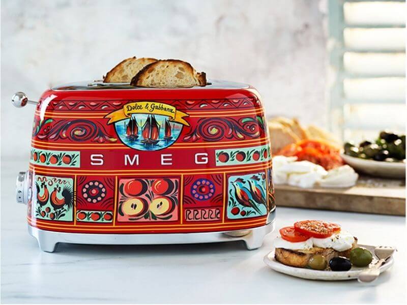Dòng máy nướng bánh mì Smeg có thiết kế bắt mắt nhất nhưng cũng với giá thành cao nhất hiện nay là các dòng máy có sự kết hợp giữa Smeg và Dolce & Gabbana. Với chủ đề Sicily Is My Love, hãng đã tạo nên các họa tiết đa sắc như Hy Lạp cổ đại.
