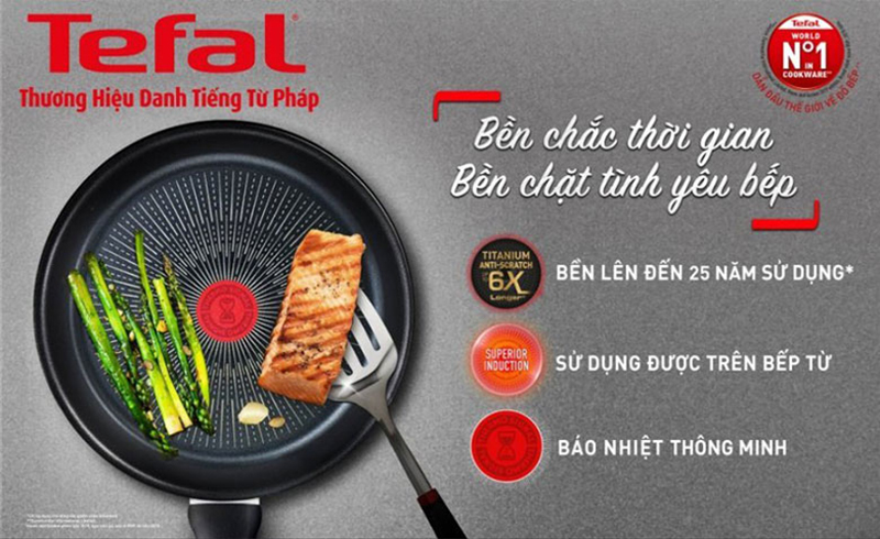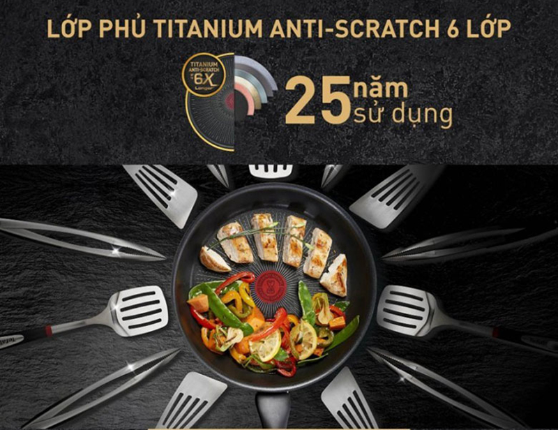 - Lớp phủ cực bền. Chảo đa năng với hiệu suất chống dính cao gấp 3 lần so với lớp phủ tiêu chuẩn Tefal Titanium nhờ bề mặt được gia cường bởi các hạt Titanium.