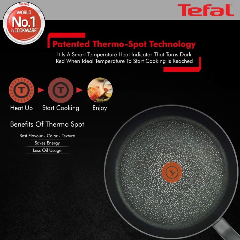 Thêm nữa, với công nghệ độc đáo Thermo–spot có trong chảo Tefal – điểm báo nhiệt độ màu đỏ ở giữa lòng chảo giúp người nấu nhận biết được khi nào chảo đủ nóng để cho thực phẩm vào, đảm bảo sự hoàn hảo trong từng món ăn.