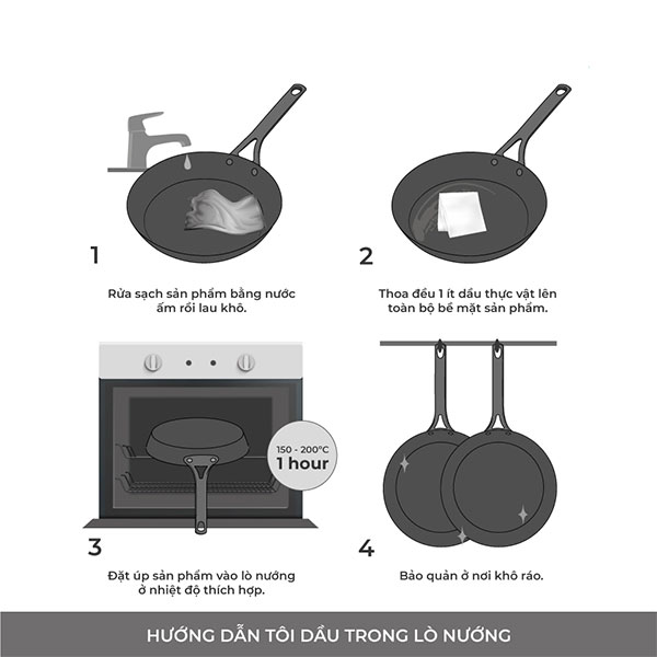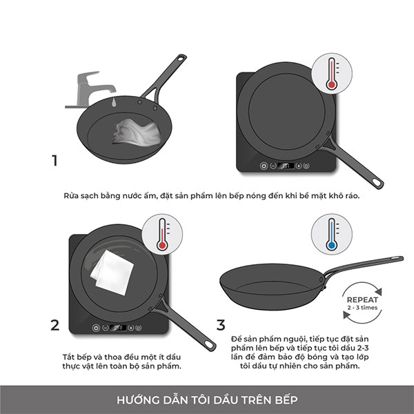 - Để sản phẩm nguội, tiếp tục đặt sản phẩm lên bếp và tiếp tục tôi dầu 2-3 lần để đảm bảo độ bóng và tạo lớp tôi dầu tự nhiên cho sản phẩm.