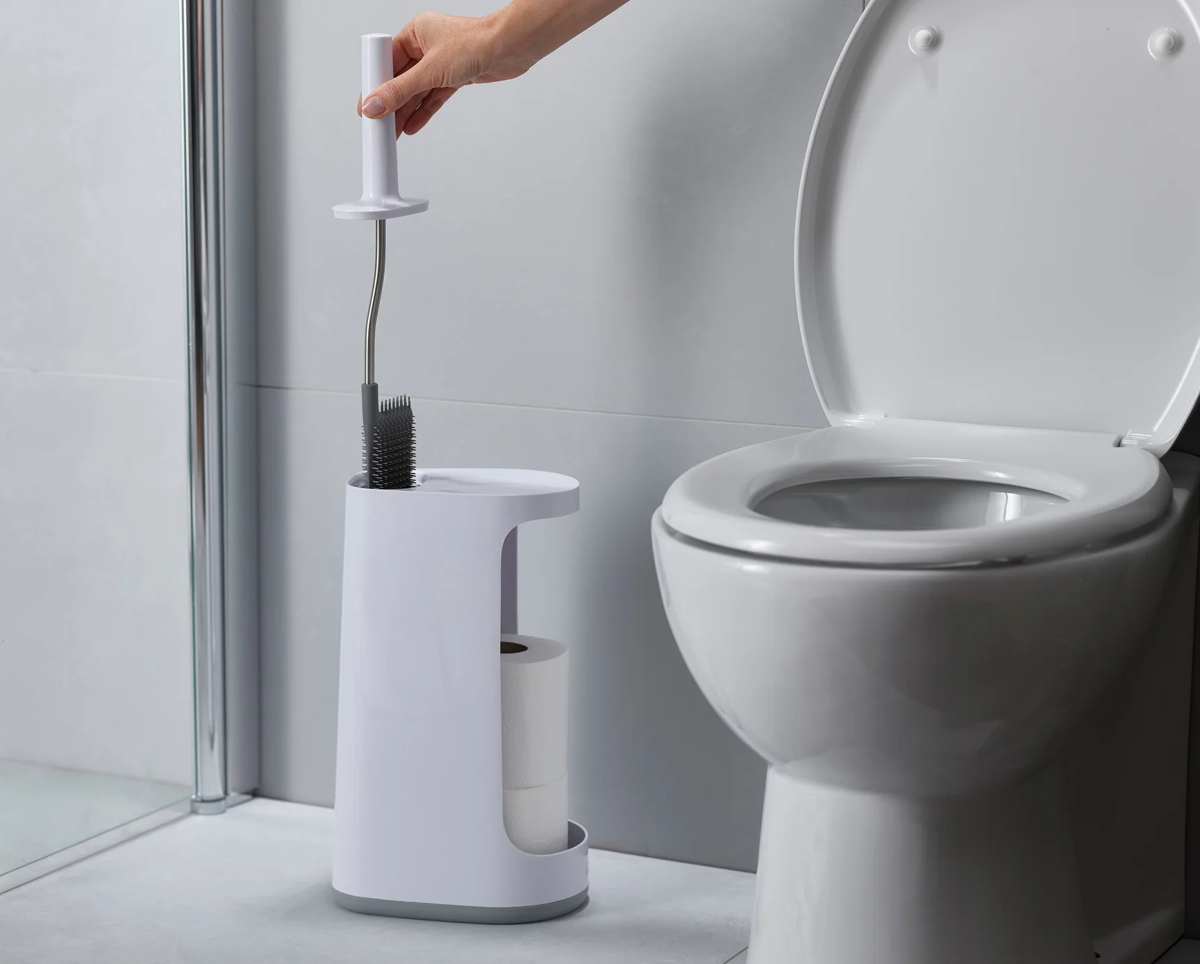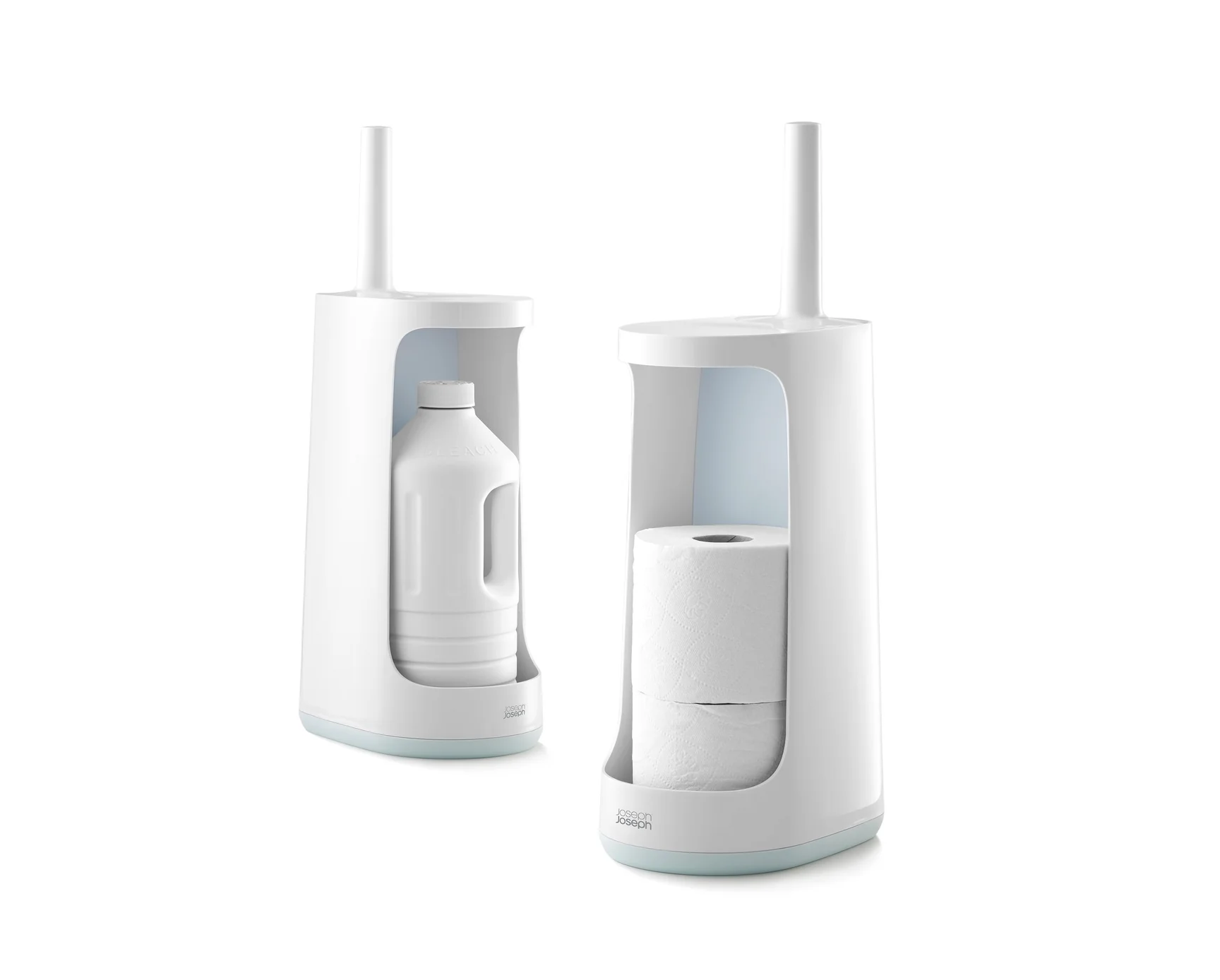 - Giải pháp lưu trữ sáng tạo này bao gồm một bàn chải vệ sinh Flex™ mang tính cách mạng trong một giá đỡ có hộp đựng cực lớn, có thể chứa tới ba cuộn giấy vệ sinh dự phòng hoặc một chai tẩy rửa lớn.