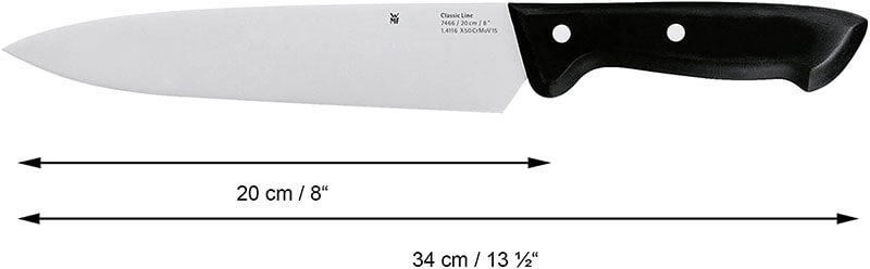 Con dao của đầu bếp là loại dao độc nhất vô nhị trong số các loại dao: lưỡi dao rộng và mạnh mẽ của nó lướt nhẹ nhàng qua cá và thịt và cắt ngay cả những loại rau củ dai nhất. Một con dao của đầu bếp cũng xử lý việc cân các loại thảo mộc và cắt hạt một cách dễ dàng: Chỉ cần đặt mũi dao lên thớt và di chuyển lưỡi dao lên xuống. Và như thể vẫn chưa đủ, bạn có thể thái đều các lát thịt như dao thái mỏng bằng mặt rộng của dao. Với rất nhiều tính linh hoạt, không có gì lạ khi dao đầu bếp nên là một phần của thiết bị cơ bản của mọi nhà bếp. WMF cung cấp cho bạn các mẫu dao khác nhau: với các chiều dài lưỡi dao khác nhau (13, 15 và 20 cm) và các đặc tính khác nhau của các bộ sưu tập dao riêng lẻ. Con dao yêu thích mới của bạn chắc chắn cũng sẽ ở đó.