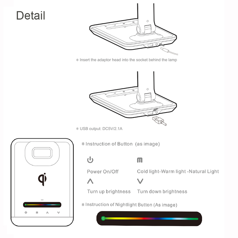 - Đèn bàn LED WILIT được trang bị bộ sạc không dây cho điện thoại di động Apple, Samsung và các thiết bị khác hỗ trợ sạc không dây. Đầu ra của bộ sạc không dây là 5 V / 1 A. Sử dụng điều khiển cảm ứng của đèn, độ sáng của đèn có thể được điều chỉnh trong phạm vi năm mức.