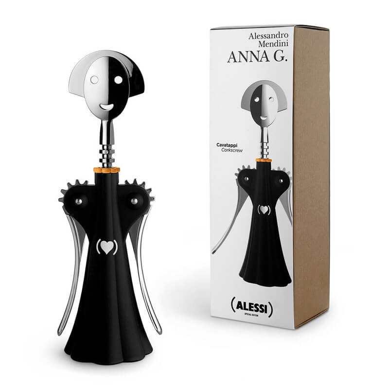 - Mở rượu vang Alessi AAM01 phần nào giống như một bức chân dung tự họa của nhà thiết kế Alessandro Mendini và tham gia loạt phim Anna thành công với tư cách là một đối tác nam. Ngoài những phẩm chất lôi cuốn của nó, dụng cụ mở chai rượu AAM01 còn đem lại niềm vui khi sử dụng.