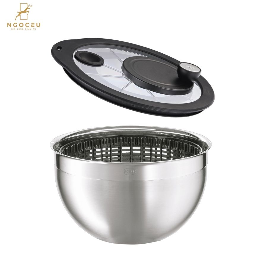 - Dụng cụ quay rau bao gồm tô Rosle nguyên bản có nắp làm bằng kính cường lực, giỏ đựng và bàn xoay. Bộ truyền động tay quay với tỷ lệ 4:1 đảm bảo kéo sợi hiệu quả. Ổ đĩa quay được đặt hơi lệch sang một bên nắp để bạn có thể thoải mái cầm bát bằng một tay. Cả hai đều có thể được vận hành dễ dàng và không cần nỗ lực nhiều. Bát thép không gỉ cũng có thể được sử dụng riêng lẻ như một bát trộn hoặc để phục vụ.