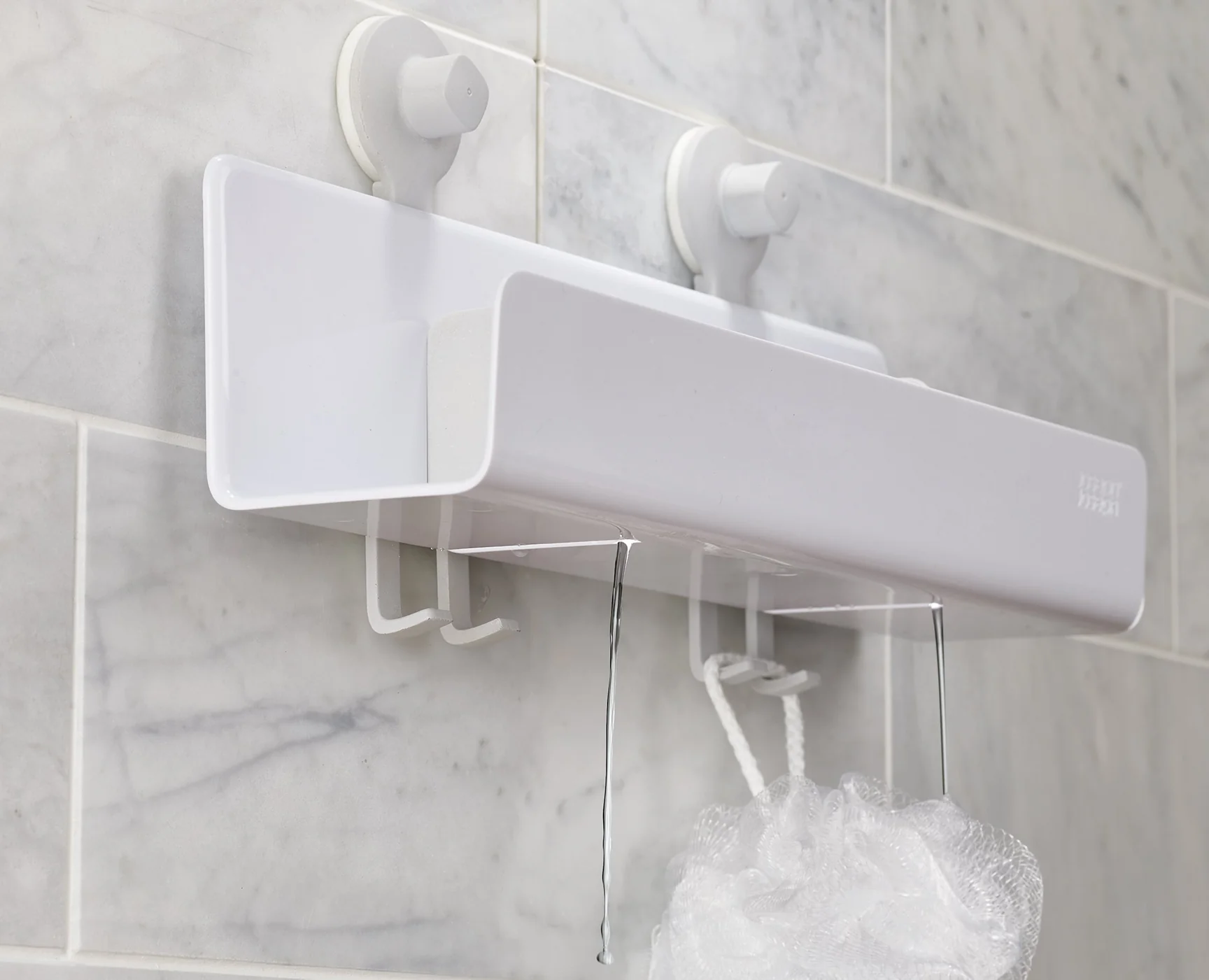 - Kệ tắm lớn này giúp loại bỏ rắc rối khi cất giữ vòi hoa sen bằng cách giữ các thanh xà phòng, sữa tắm và chai dầu gội đầu, đồng thời có móc cho dao cạo râu, bọt biển và vải nỉ và gương acrylic chống vỡ có bản lề, có thể tháo rời.