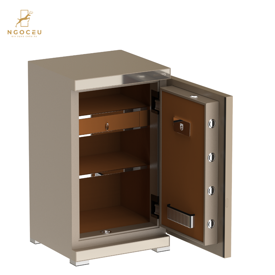 - Thiết kế chắc chắn, thông minh bên trong két: Ngăn chứa bí mật dưới cùng cho phép lưu trữ với không gian tương đối lớn không kém gì các ngăn phía trên.Các khay đựng đồ trang sức ở ngăn két trên được thiết kế tối ưu không gian, giúp lưu trữ và phân loại trang sức một cách tiện lợi. Nội thất ngăn két trên sử dụng chất liệu bọc da cao cấp đảm bảo các món đồ trang sức được nâng niu nhất.Bên cạnh đó két sắt còn thiết kế chân sạc cung cấp hệ thống điện cho két sắt phòng trường hợp hết pin.