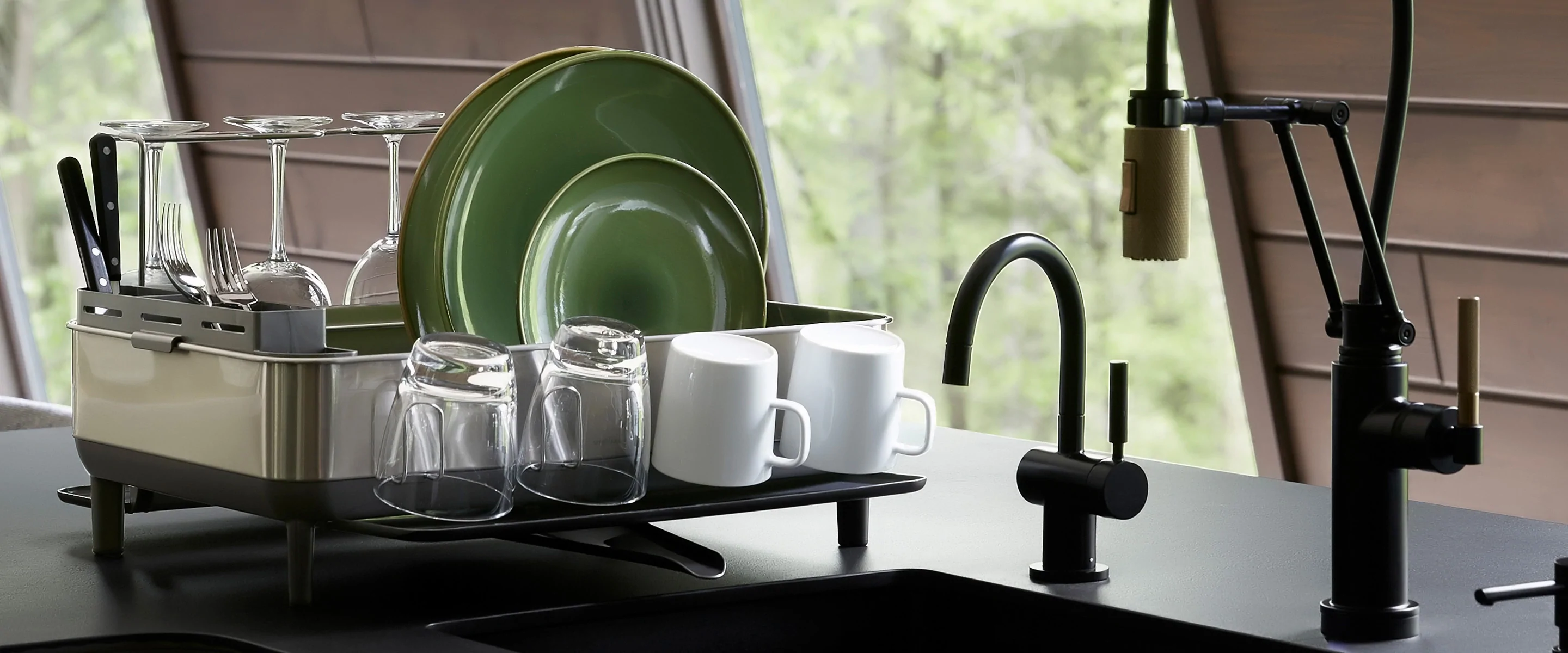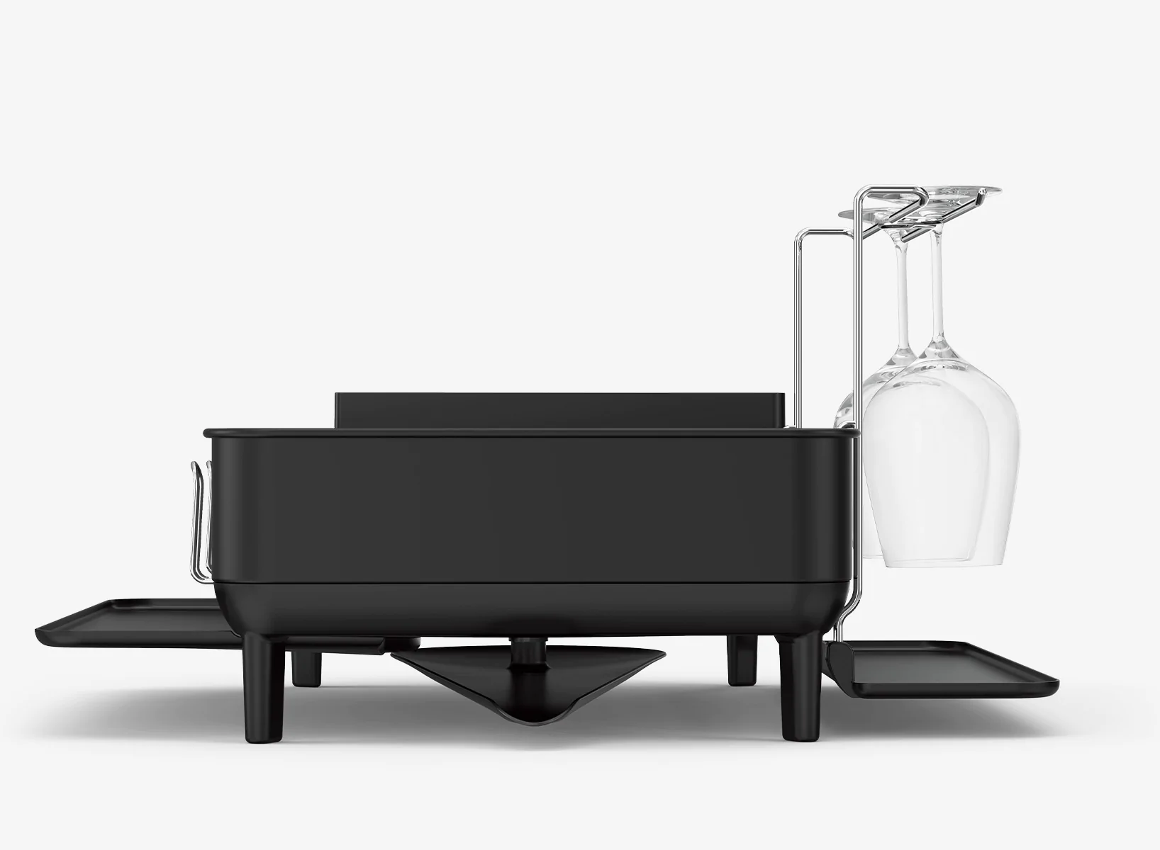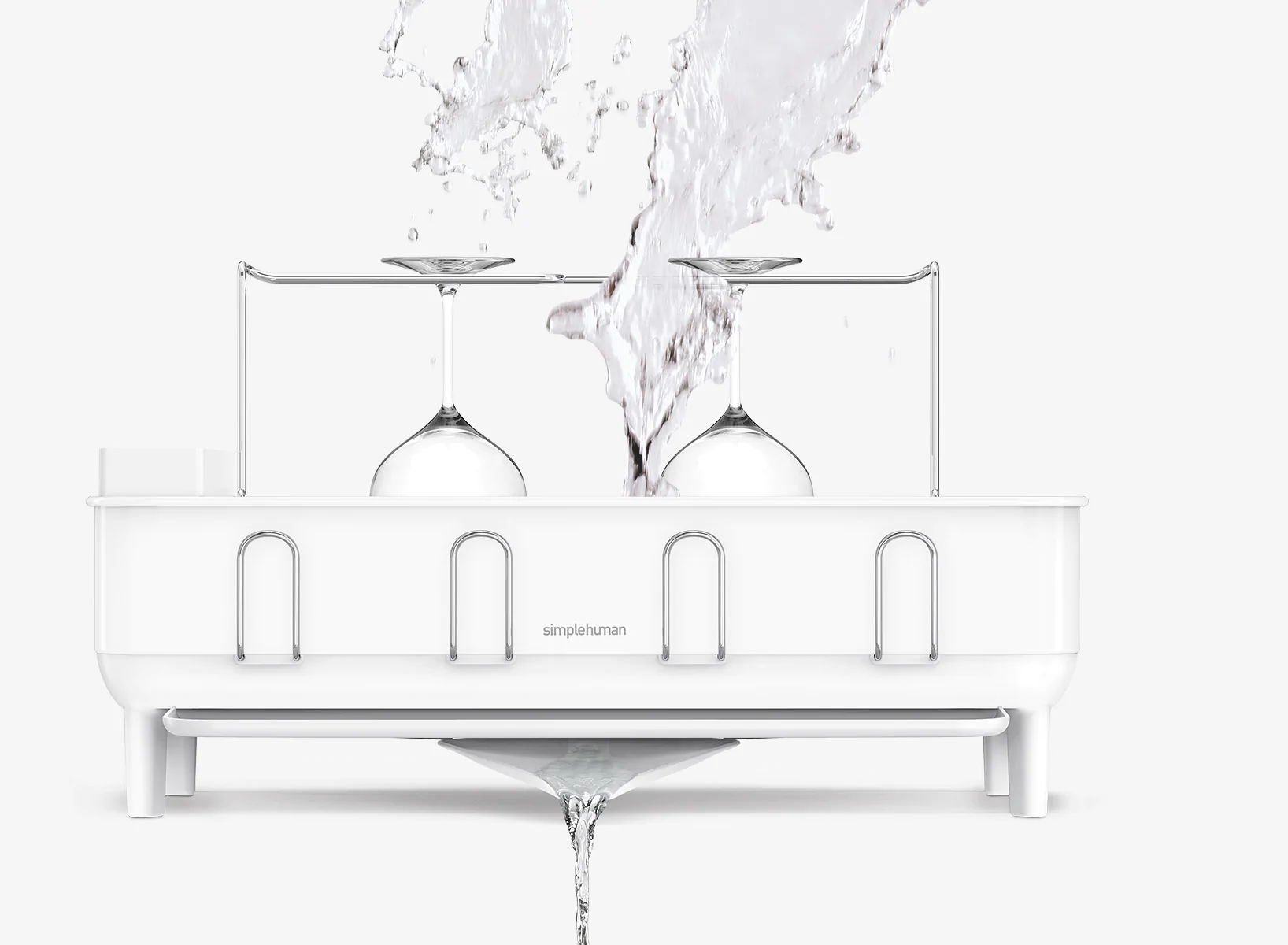 - giá để bát đĩa khung thép của simplehuman có hệ thống thoát nước sáng tạo bao gồm khay nhỏ giọt tích hợp với vòi xoay có thể xoay để giữ nước chảy trực tiếp vào bồn rửa chứ không phải trên mặt bàn.