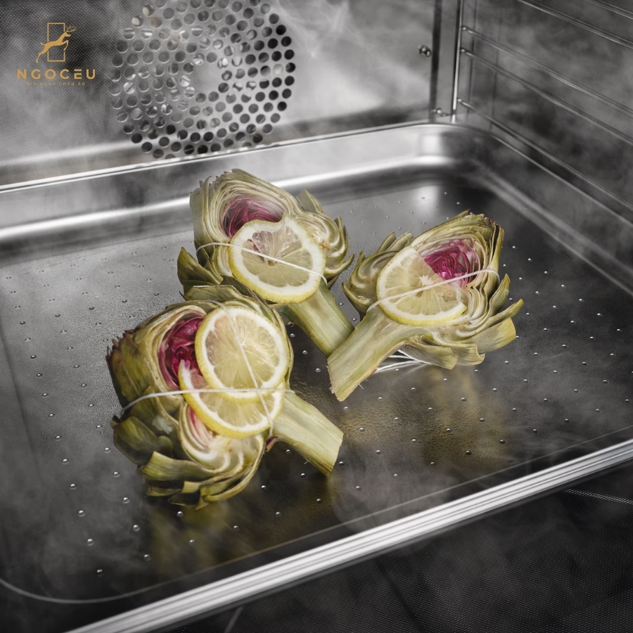 - Chế độ nấu kết hợp (Combination Cooking): Sự kết hợp linh hoạt giữa hơi nước và nhiệt khô mang lại kết quả tuyệt vời: bề mặt món ăn giòn rụm trong khi bên trong vẫn mềm ngọt, mọng nước. Đây là chế độ lý tưởng cho các món nướng, quay và bánh mì.