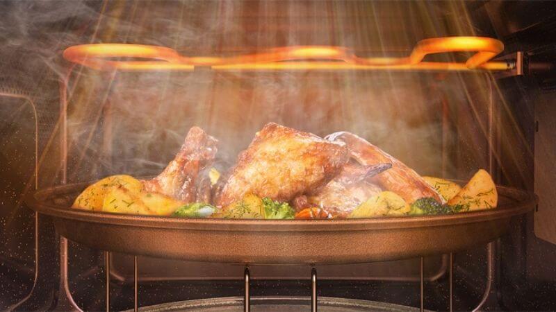 Cụ thể quá trình hoạt động: Sau khi ấn nút khởi động khoảng 2 giây, lò sẽ sinh ra những bước sóng cực nhỏ và thổi vào khoang nấu. Các bước sóng này khi gặp các bức vách lò sẽ phản xạ ngược lại và chuyển động quanh lò.