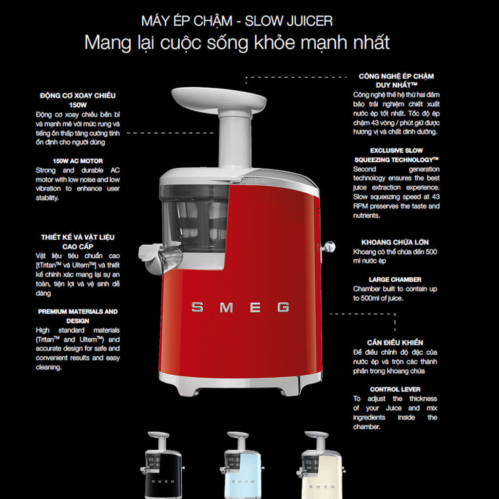 Nhờ quá trình ép lạnh chậm và nhẹ nhàng, các chất dinh dưỡng được giữ lại trong nguyên liệu ngay cả với trái cây và rau quả cứng. Máy ép trái cây chậm Smeg tạo ra nước ép chất lượng cao nhất, có hương vị và với màu sắc rực rỡ của các thành phần trái cây của nó, nhờ vào nước ép lạnh hoàn toàn không sử dụng lưỡi dao mà là một vòng quay chậm và mạnh mẽ của bơm trục vít. Mạnh mẽ và hiệu quả…Ngày nay Smeg được biết đến trên toàn thế giới với thiết kế nổi bật. Cả thiết bị lớn và thiết bị nhỏ của chúng tôi đều đã nhận được một số giải thưởng thiết kế danh giá. Một trong những người chiến thắng: Máy ép trái cây chậm Smeg SJF01. Nó đã nhận được Giải thưởng Thiết kế Tốt 2016