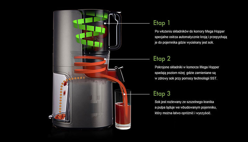– Buồng chứa rộng nhất trên thị trường có thể chứa tất cả các loại trái cây và rau quả, hệ thống đùn tự động