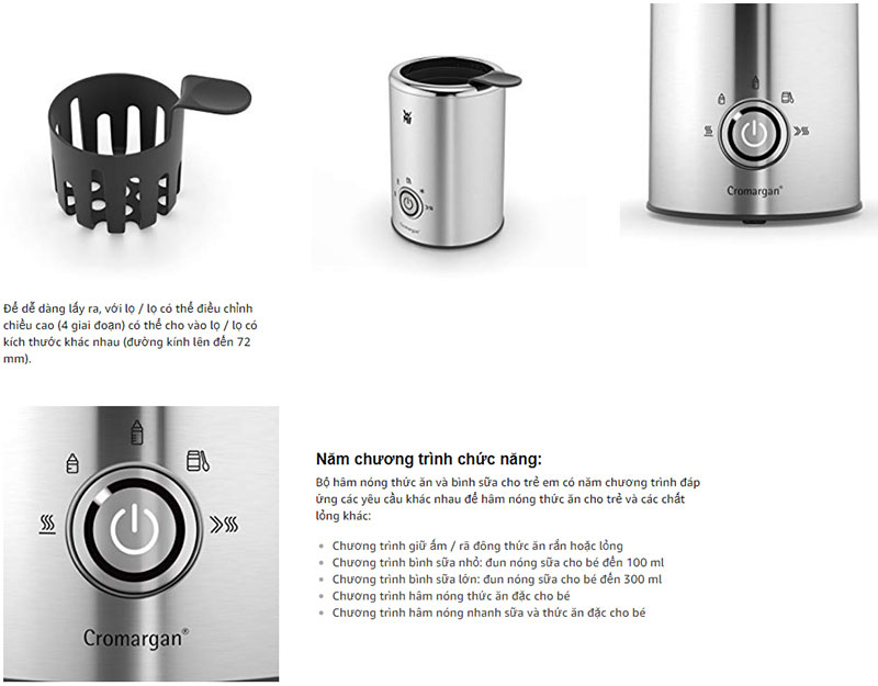 Giải pháp cho bố mẹ nuôi con nhỏ. Quá mất nhiều thời gian lách cách hâm lại đồ ăn cho bé. Hiện nay hãng sản xuất WMF gia dụng Germany xin giới thiệu. Máy hâm sữa và đồ ăn cho em bé. Máy có 5 chức năng rất tiện cho mẹ chăm em bé.
