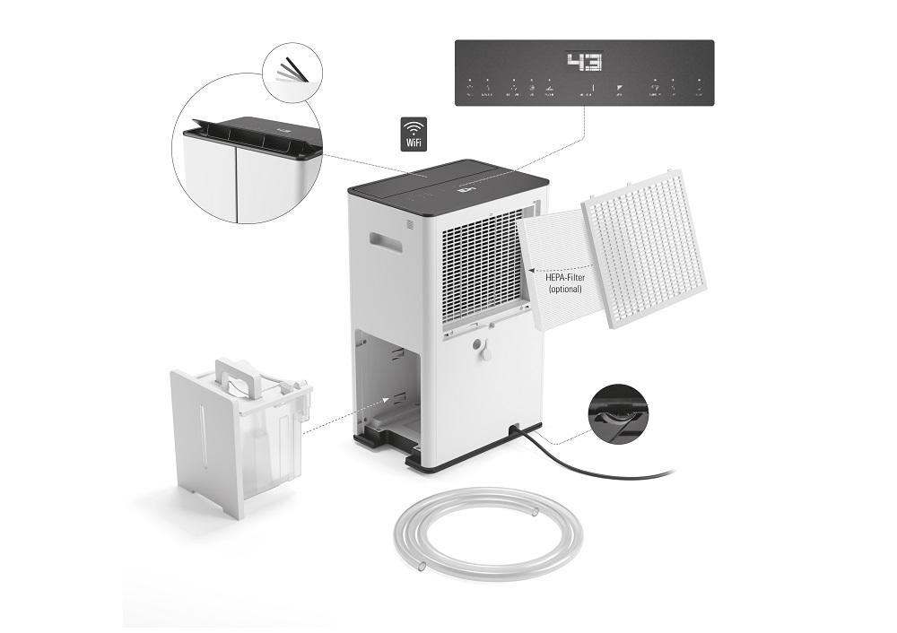 - Công suất hút ẩm lên tới 20 lít mỗi ngày (ở 30° C và 80 %). Hiển thị độ ẩm kỹ thuật số, có thể điều chỉnh đến độ ẩm từ 30–80 % hoặc hoạt động liên tục.