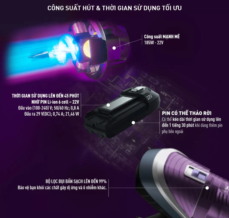Hiệu suất làm sạch mạnh mẽ, thời gian hoạt động dài