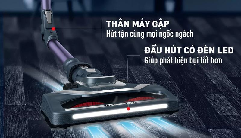 - Đầu hút: Có đèn LED giúp soi rõ bụi khi hút ở dưới gầm giường tủ, bóng tối