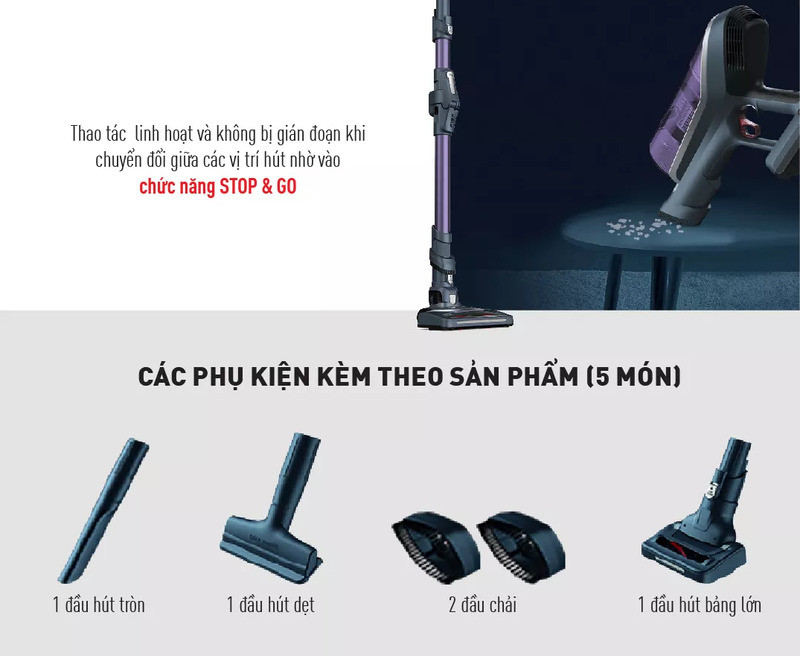 - Phụ kiện: 5 món (1 đầu hút tròn, 1 đầu hút dẹt, 2 đầu chải, 1 đầu hút bảng lớn)