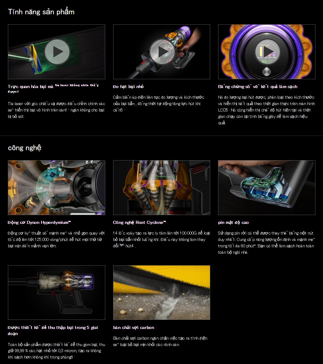 - Động cơ kỹ thuật số siêu nhẹ và mạnh mẽ có tốc độ quay tới 125.000 vòng/phút để hút bụi cực nhỏ và các mảnh vụn lớn.