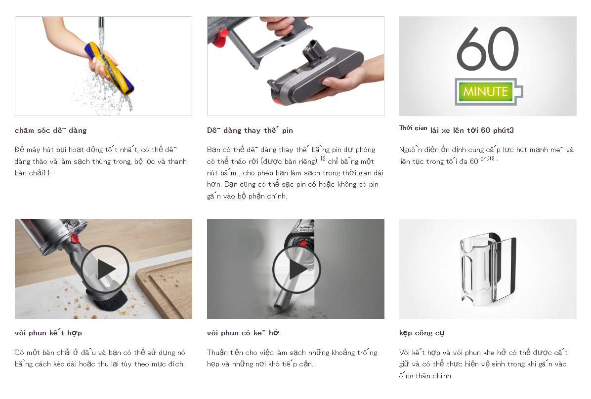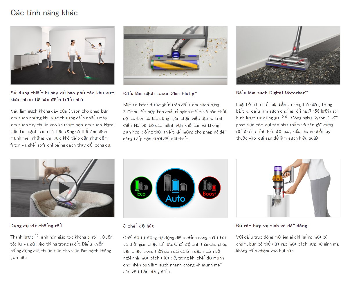- Tính linh hoạt của công nghệ không dây Dyson giúp việc dọn dẹp nhà cửa của bạn trở nên dễ dàng hơn. Làm sạch mạnh mẽ trên sàn nhà, những nơi khó tiếp cận và trên đệm.