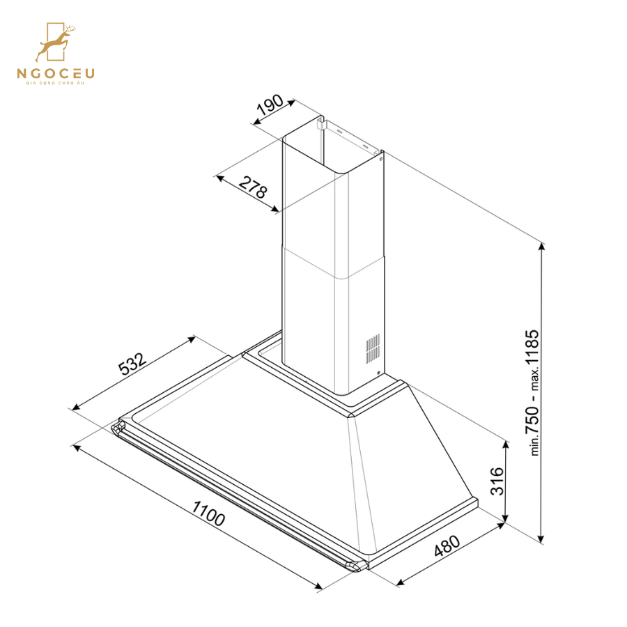 - Khoảng cách tối thiểu tới bếp điện: 60 cm