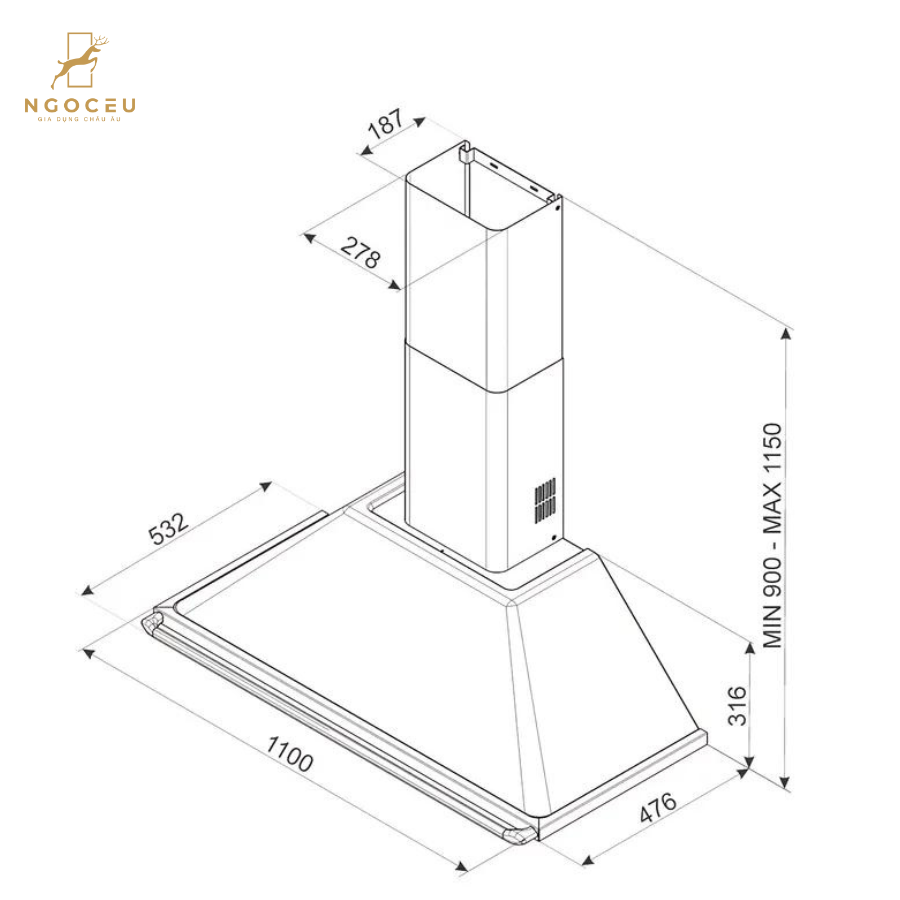 - Khoảng cách lắp đặt tối thiểu trên bếp gas: 750 mm
