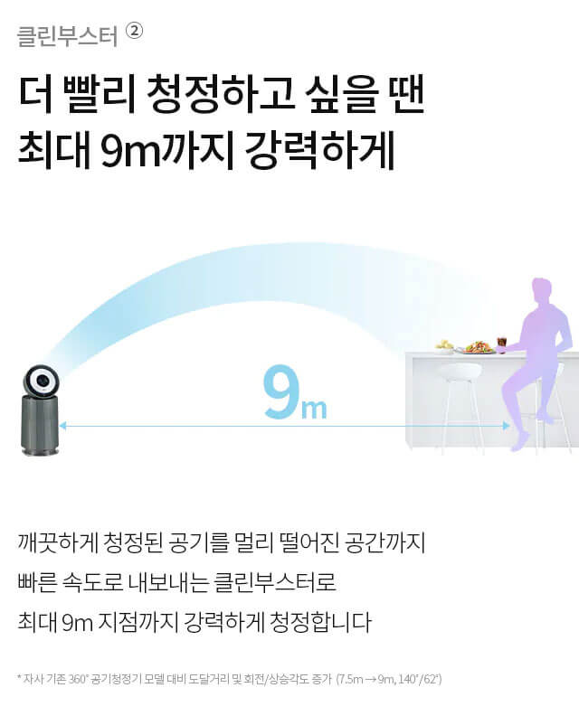 – Máy lọc không khí LG sở hữu bộ đẩy khi sạch Clean Booster giúp cung cấp đén người dùng không khí sạch, đồng thời lượng khi này cũng đi xa hơn lên đến 7.5m đảm bảo phân bổ đều khí sạch khắp các căn phòng.