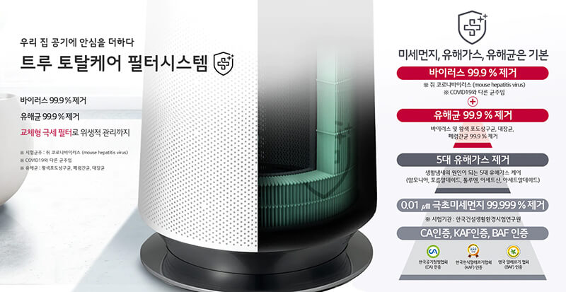 Sản phẩm đạt chứng nhận loại bỏ khí độc hại từ Hiệp hội làm sạch không khí Hàn Quốc . Làm sạch khí độc hại, bụi bẩn cùng một lúc mang đến không khí trong lành tự nhiên.